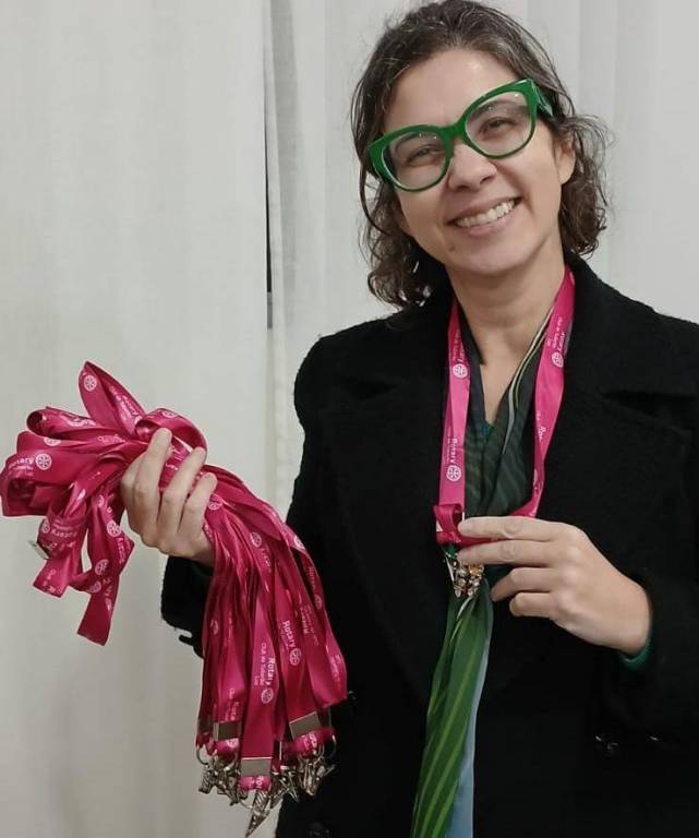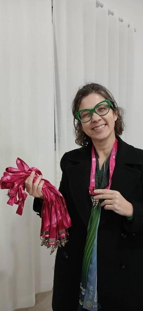Com carinho, entregou a cada uma delas um cordão cor-de-rosa, acessório destinado à colocação dos pins de acordo com as funções e atividades exercidas no clube, além de servir também como suporte para os crachás utilizados em ações voluntárias e capacitações.
